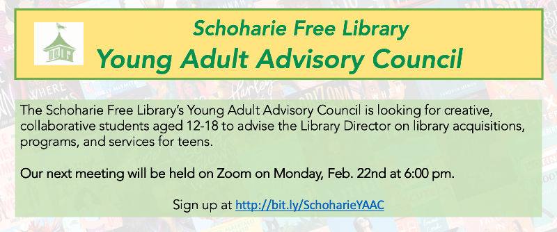 12-18 year-olds living in the Schoharie Central School District are invited to participate in the Schoharie Library’s Young Adult Advisory Council. To sign up, visit bit.ly/SchoharieYAAC. Our next meeting is online on Monday, Feb. 22 at 6:00 pm.