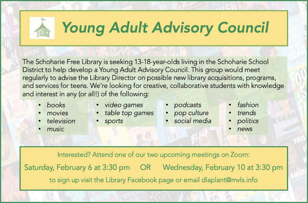The Schoharie Free Library will be holding two interest meetings for 13-18 year-olds in the Schoharie School District interested in helping found a YA Council. This group will advise the library director on library purchases, programs, and services for teens. To sign up, follow the links below or visit the Library’s Facebook Events page.