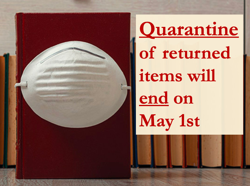 - While the quarantine was in effect, patrons were given additional “fine-free days” beyond the due date to accommodate the quarantine period. Starting May 1st, this grace period will be discontinued. Late fees will begin to accrue the day after an item is due, just like before the pandemic.